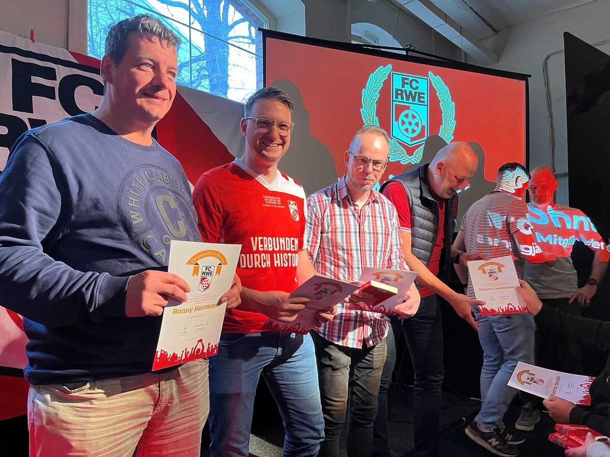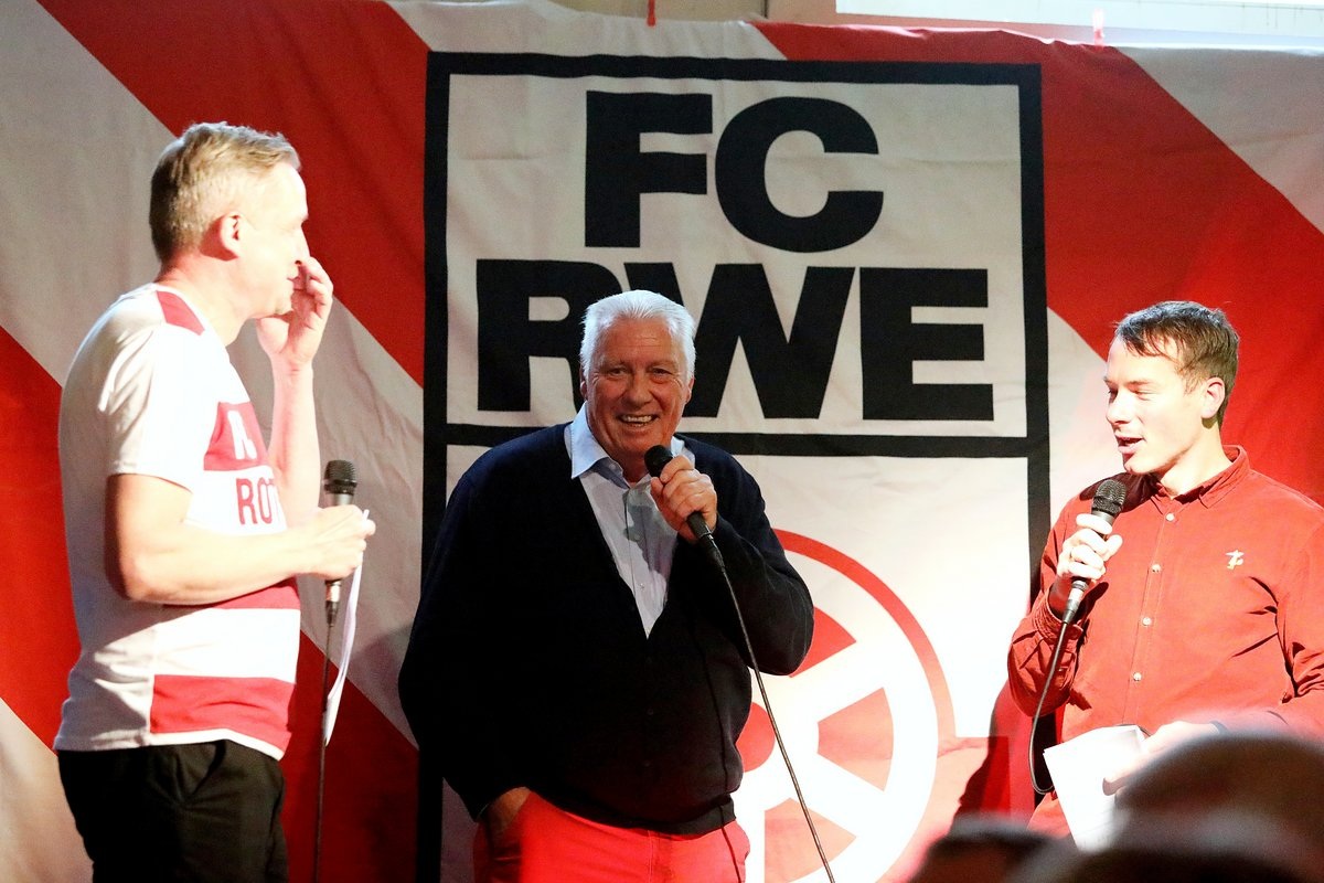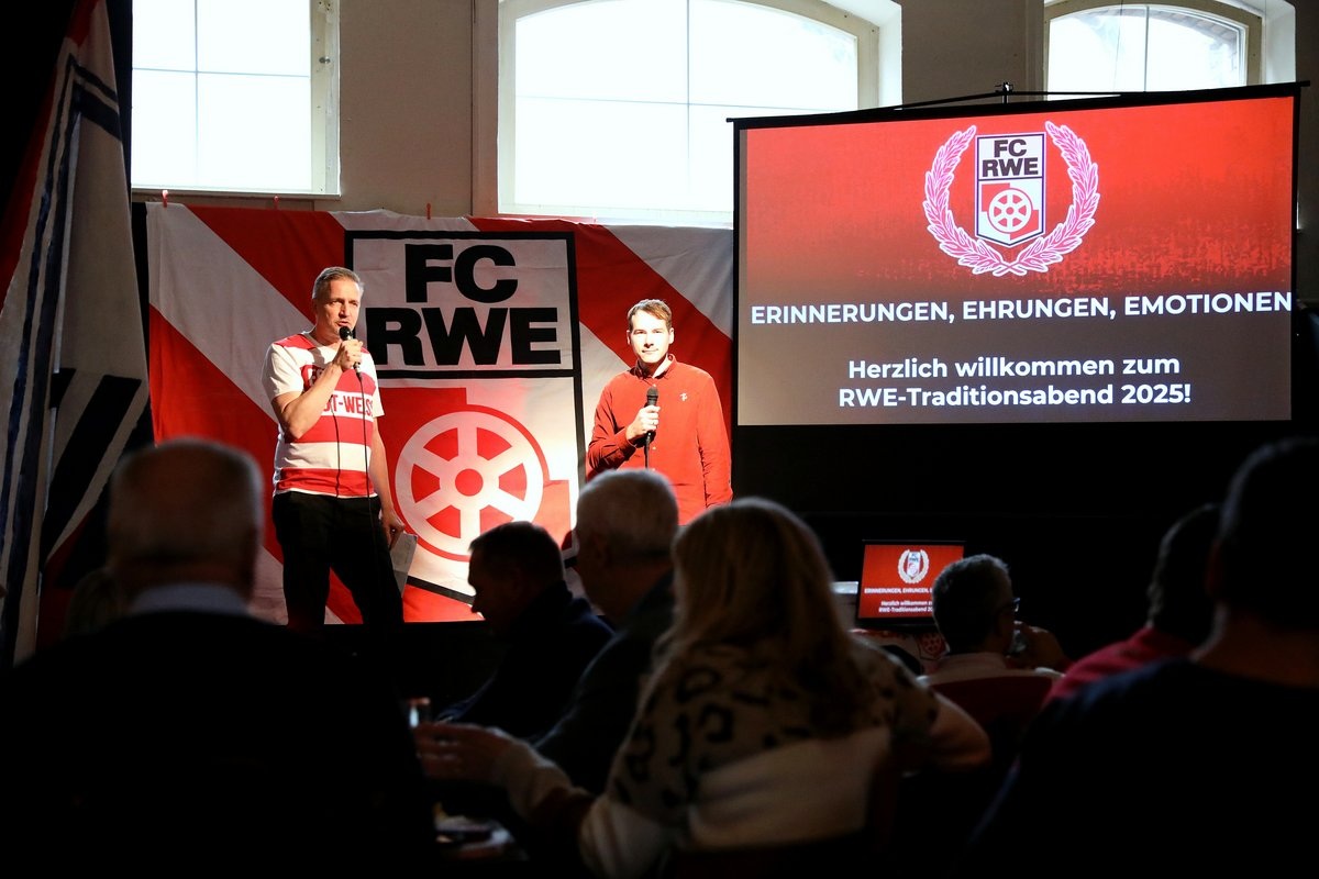 Auch zwei Männer, ohne die Rot-Weiß heute deutlich anders dastünde, wurden gewürdigt: Olaf Schwertner, für seinen großzügigen Verkauf wichtiger Medaillen und Urkunden an Rot-Weiß, und Kurt Gaida, der die von ihm vor der Entsorgung geretteten Pokale und Urkunden an RWE übergab.